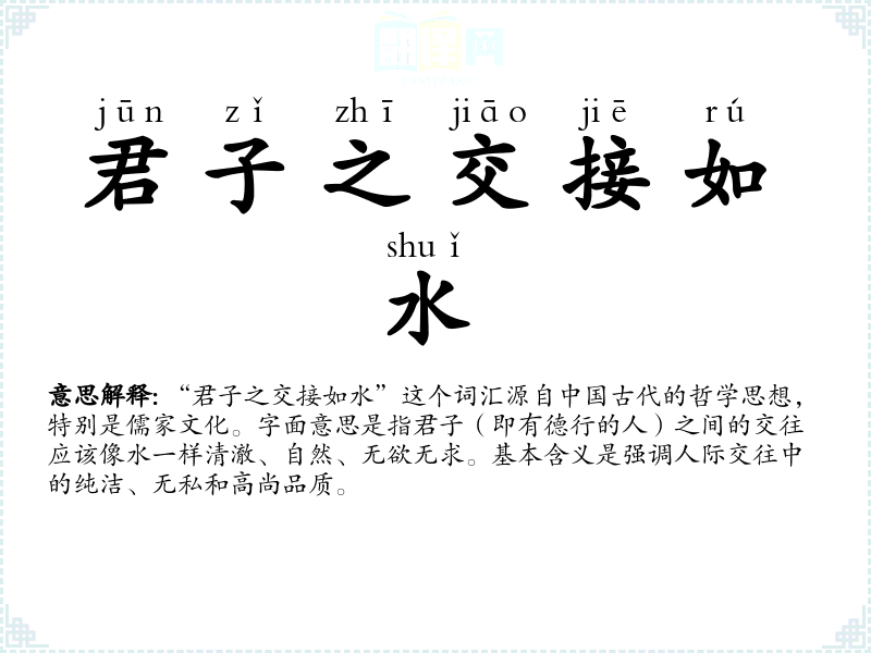 “君子之交接如水”这个词汇源自**古代的哲学思想,特别是儒家文化。字面意思是指君子(即有德行的人)之间的交往应该像水一样清澈、自然、无欲无求。基本含义是强调人际交往中的纯洁、无私和高尚品质。