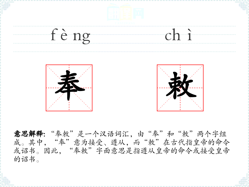 “奉敕”是一个具有深厚历史和文化背景的词汇,它不仅反映了古代*的政治结构,也体现了对权威的尊重和遵从。在语言学和表达中,了解这样的词汇有助于更深入地理解**历史和文化。