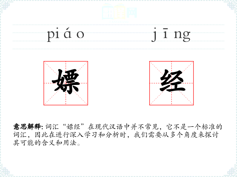 “嫖经”这个词组由两个字组成:“嫖”和“经”。在现代汉语中,“嫖”通常指不正当的性行为,尤其是指男性花钱与女性发生性关系的行为。而“经”字在不同的语境中可以有多种含义,如经典、经验等。将这两个字组合在一起,“嫖经”可能指的是关于不正当性行为的经验或指南,但这并不是一个正式或常见的词汇。
