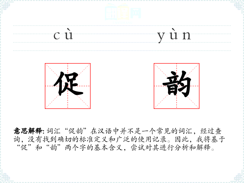 词汇“促韵”在汉语中并不是一个常见的词汇,经过查询,没有找到确切的标准定义和广泛的使用记录。因此,我将基于“促”和“韵”两个字的基本含义,尝试对其进行分析和解释。