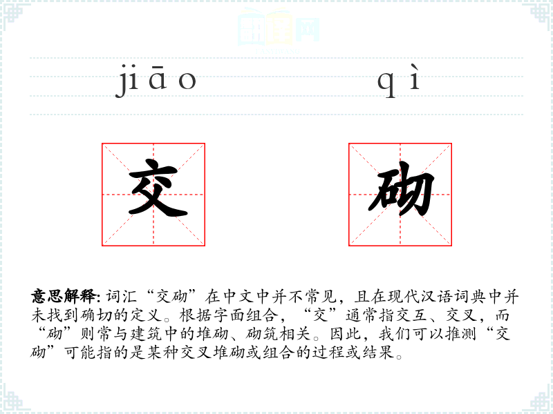 词汇“交砌”在中文中并不常见,且在现代汉语词典中并未找到确切的定义。根据字面组合,“交”通常指交互、交叉,而“砌”则常与建筑中的堆砌、砌筑相关。因此,我们可以推测“交砌”可能指的是某种交叉堆砌或组合的过程或结果。