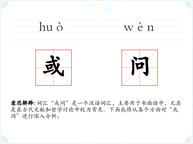 “或问”字面意思是指“有人问”或“或许有人会问”。它通常用于引出一个问题或假设性的提问,以便进行进一步的讨论或解释。