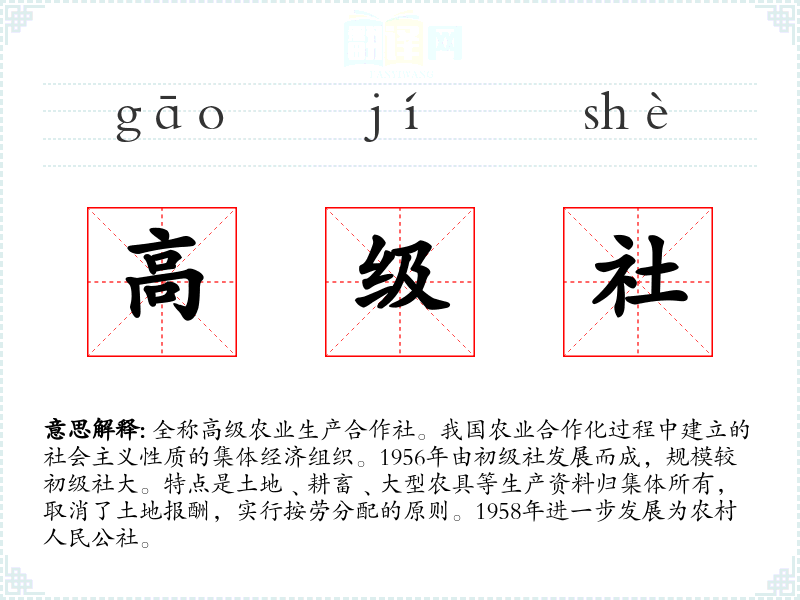 1.全称高级农业生产合作社。我国农业合作化过程中建立的社会主义性质的集体经济组织。1956年由初级社发展而成,规模较初级社大。特点是土地﹑耕畜﹑大型农具等生产资料归集体所有,取消了土地报酬,实行按劳分配的原则。1958年进一步发展为农村人民公社。