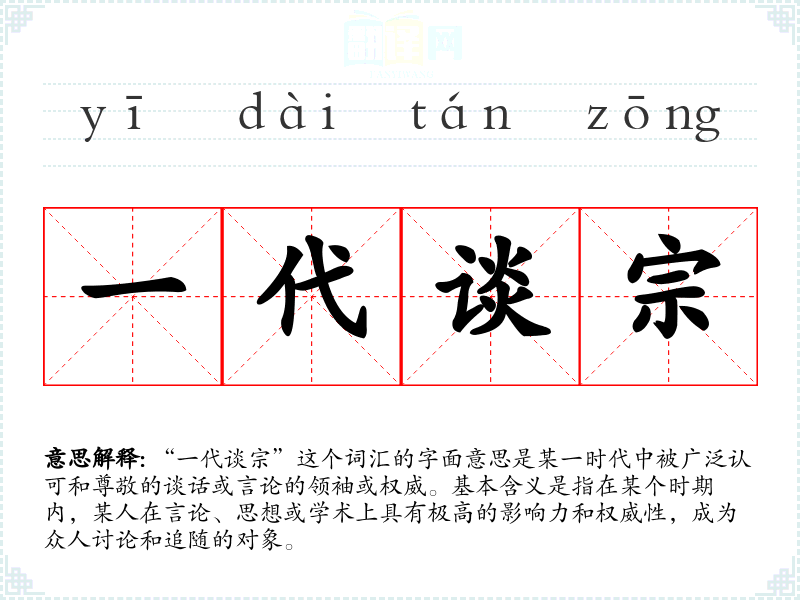“一代谈宗”这个词汇的字面意思是某一时代中被广泛认可和尊敬的谈话或言论的领袖或权威。基本含义是指在某个时期内,某人在言论、思想或学术上具有极高的影响力和权威性,成为众人讨论和追随的对象。