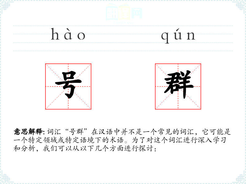 词汇“号群”在汉语中并不是一个常见的词汇,它可能是一个特定领域或特定语境下的术语。为了对这个词汇进行深入学习和分析,我们可以从以下几个方面进行探讨: