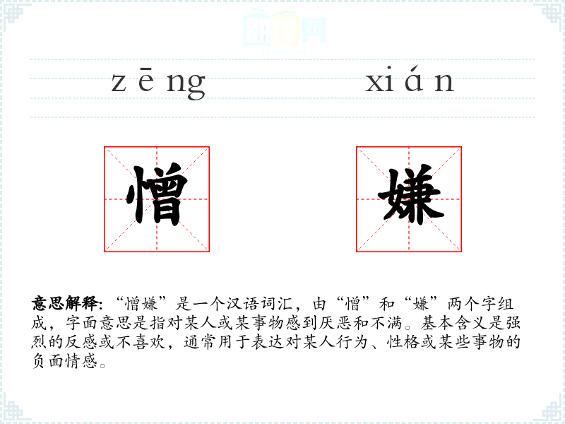 “憎”字最早见于《说文解字》,意为恨。“嫌”字则有猜疑和不满的意思。两者结合,形成了“憎嫌”这个词汇,用以表达更强烈的负面情感。随着语言的发展,这个词的使用逐渐固定,成为表达强烈不满和厌恶的常用词汇。