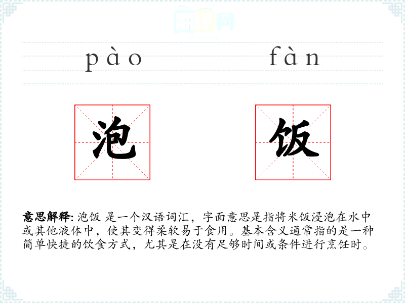 泡饭 是一个汉语词汇,字面意思是指将米饭浸泡在水中或其他液体中,使其变得柔软易于食用。基本含义通常指的是一种简单快捷的饮食方式,尤其是在没有足够时间或条件进行烹饪时。
