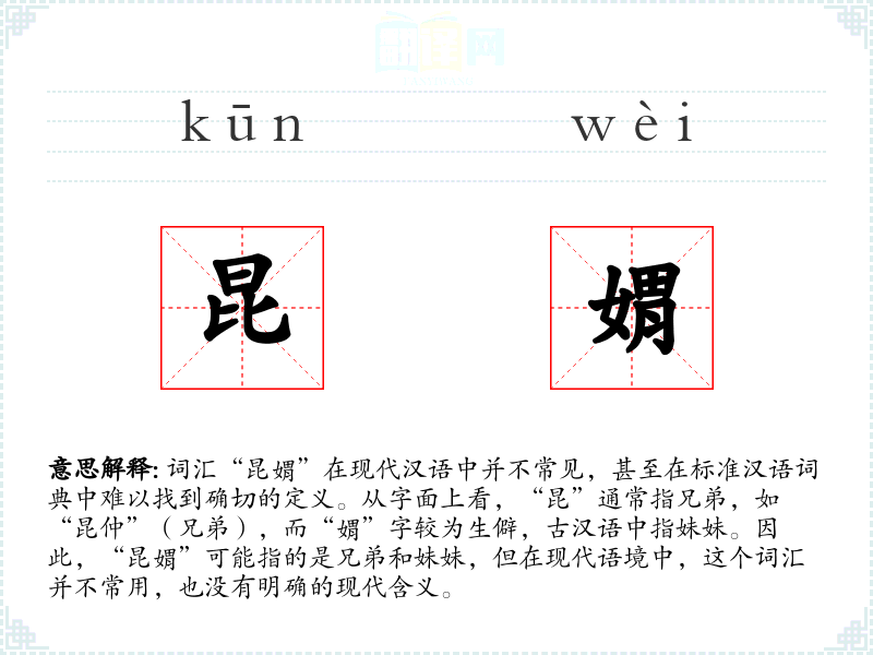 “昆”字源自古汉语,意为兄弟,而“媦”字也源自古汉语,意为妹妹。这两个字组合在一起,可能反映了古代对家庭成员关系的特定表述,但随着语言的发展,这种表述已不再流行。