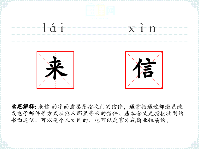 来信 的字面意思是指收到的信件,通常指通过邮递系统或电子邮件等方式从他人那里寄来的信件。基本含义是指接收到的书面通信,可以是个人之间的,也可以是官方或商业性质的。