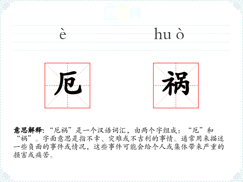 “厄”字古已有之,原意为狭窄、困难,后引申为不幸、灾难。“祸”字则直接与灾难、不幸相关。两个字组合在一起,强化了不幸和灾难的意味。