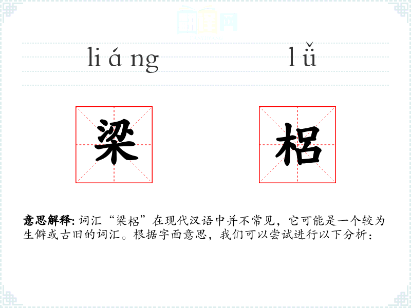词汇“梁梠”在现代汉语中并不常见,它可能是一个较为生僻或古旧的词汇。根据字面意思,我们可以尝试进行以下分析: