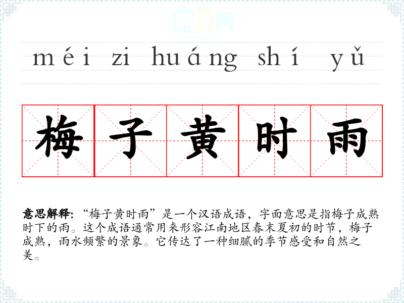 “梅子黄时雨”是一个汉语成语,字面意思是指梅子成熟时下的雨。这个成语通常用来形容江南地区春末夏初的时节,梅子成熟,雨水频繁的景象。它传达了一种细腻的季节感受和自然之美。