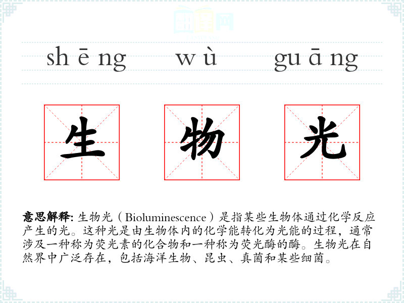 - 同义词:荧光(Fluorescence),但荧光通常是指物质吸收光能后重新发射光能的过程,与生物光的发光机制不同。