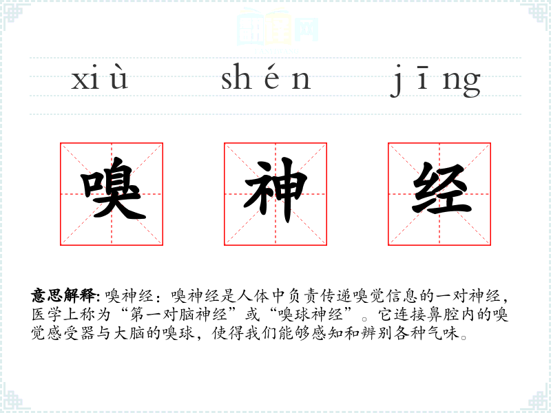 同义词:嗅觉神经、第一脑神经 反义词:无直接反义词,但可以与“视觉神经”、“听觉神经”等其他感官神经进行对比。