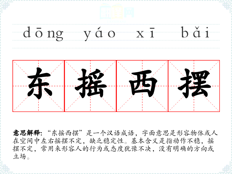 “东摇西摆”是一个汉语成语,字面意思是形容物体或人在空间中左右摇摆不定,缺乏稳定性。基本含义是指动作不稳,摇摆不定,常用来形容人的行为或态度犹豫不决,没有明确的方向或立场。