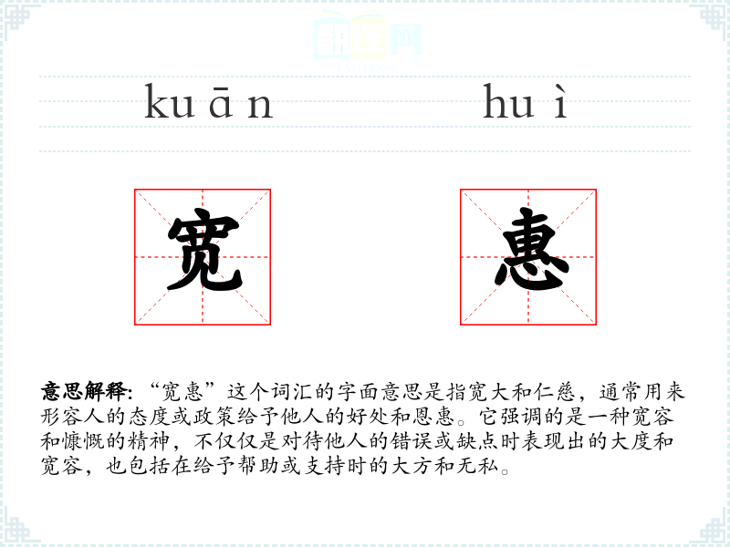 “宽惠”这个词汇的字面意思是指宽大和仁慈,通常用来形容人的态度或政策给予他人的好处和恩惠。它强调的是一种宽容和慷慨的精神,不仅仅是对待他人的错误或缺点时表现出的大度和宽容,也包括在给予帮助或支持时的大方和无私。