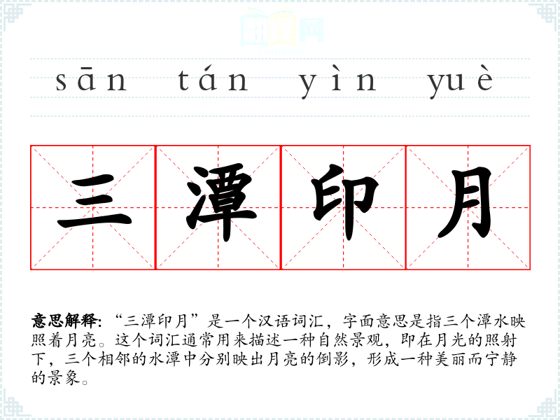 “三潭印月”是一个汉语词汇,字面意思是指三个潭水映照着月亮。这个词汇通常用来描述一种自然景观,即在月光的照射下,三个相邻的水潭中分别映出月亮的倒影,形成一种美丽而宁静的景象。