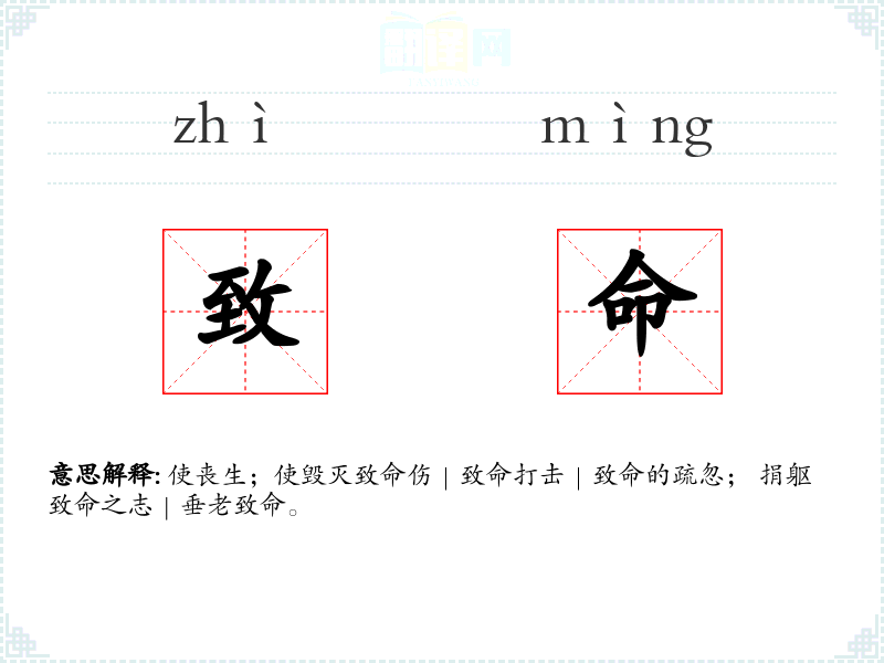 使丧生;使毁灭致命伤|致命打击|致命的疏忽; 捐躯致命之志|垂老致命。