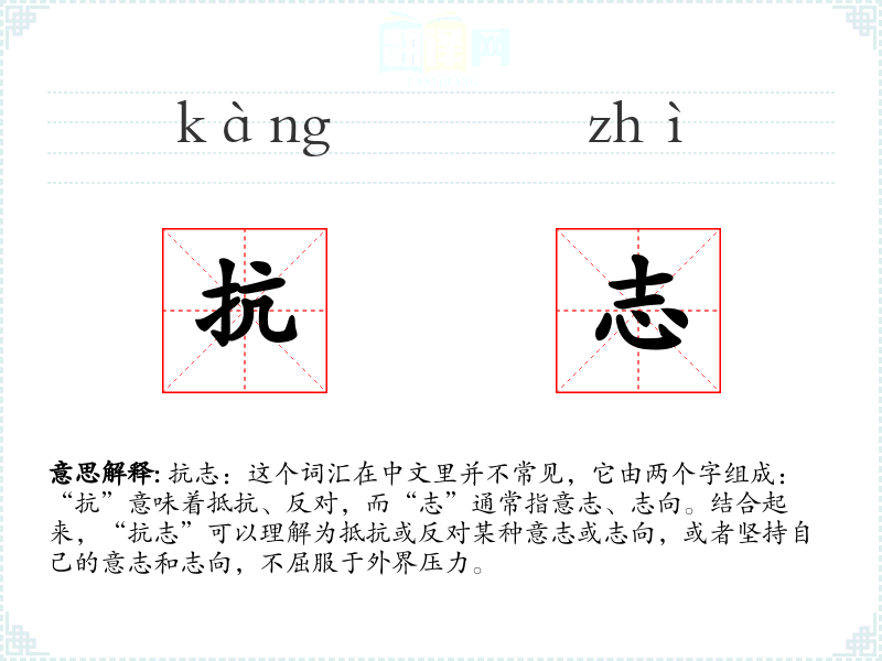 抗志:这个词汇在中文里并不常见,它由两个字组成:“抗”意味着抵抗、反对,而“志”通常指意志、志向。结合起来,“抗志”可以理解为抵抗或反对某种意志或志向,或者坚持自己的意志和志向,不屈服于外界压力。