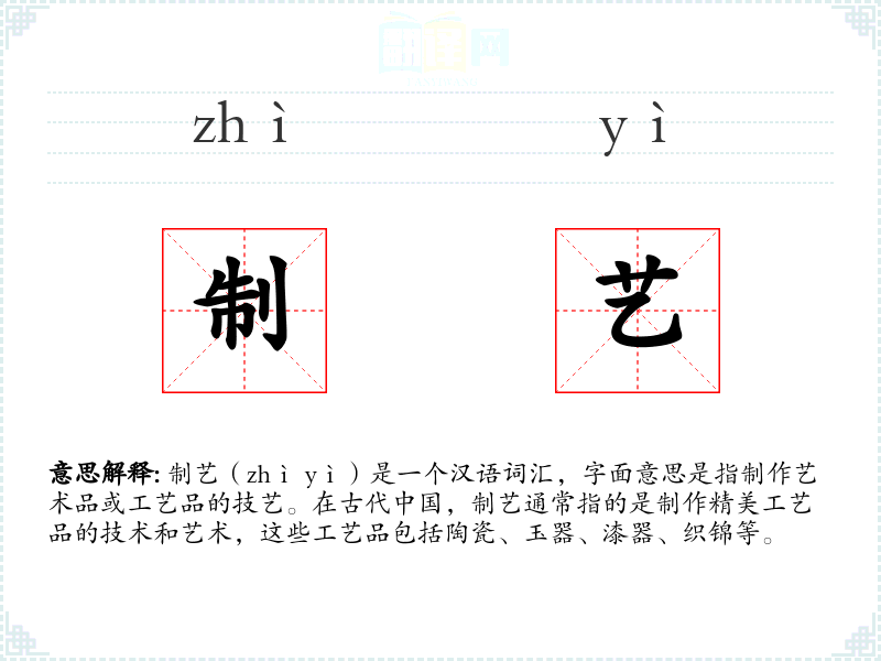制艺(zhì yì)是一个汉语词汇,字面意思是指制作艺术品或工艺品的技艺。在古代**,制艺通常指的是制作精美工艺品的技术和艺术,这些工艺品包括陶瓷、玉器、漆器、织锦等。