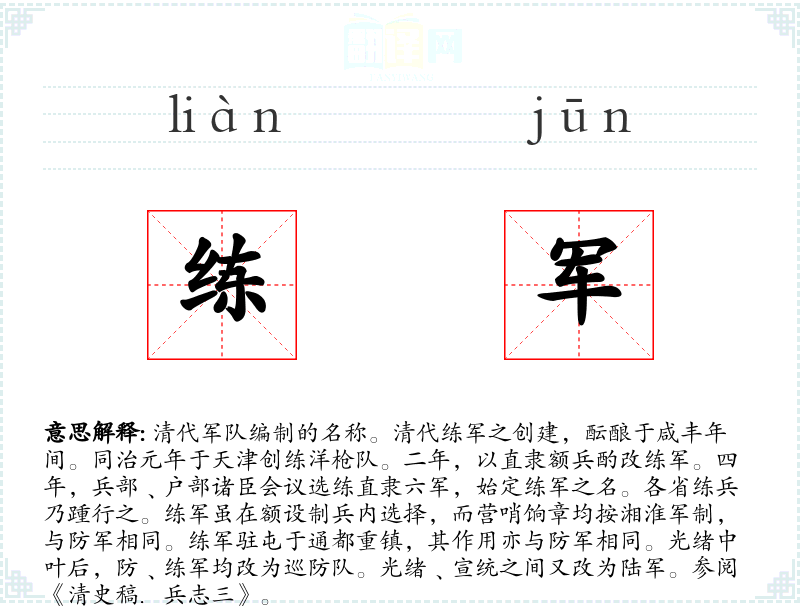 1.清代军队编制的名称。清代练军之创建,酝酿于咸丰年间。同治元年于天津创练洋枪队。二年,以直隶额兵酌改练军。四年,兵部﹑户部诸臣会议选练直隶六军,始定练军之名。各省练兵乃踵行之。练军虽在额设制兵内选择,而营哨饷章均按湘淮军制,与防军相同。练军驻屯于通都重镇,其作用亦与防军相同。光绪中叶后,防﹑练军均改为巡防队。光绪﹑宣统之间又改为陆军。参阅《清史稿.兵志三》。