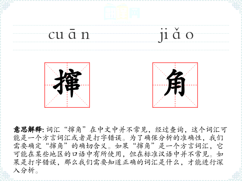 词汇“撺角”在中文中并不常见,经过查询,这个词汇可能是一个方言词汇或者是打字错误。为了确保分析的准确性,我们需要确定“撺角”的确切含义。如果“撺角”是一个方言词汇,它可能在某些地区的口语中有所使用,但在标准汉语中并不常见。如果是打字错误,那么我们需要知道正确的词汇是什么,才能进行深入分析。