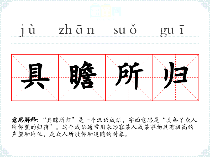 “具瞻所归”是一个汉语成语,字面意思是“具备了众人所仰望的归宿”。这个成语通常用来形容某人或某事物具有极高的声望和地位,是众人所敬仰和追随的对象。