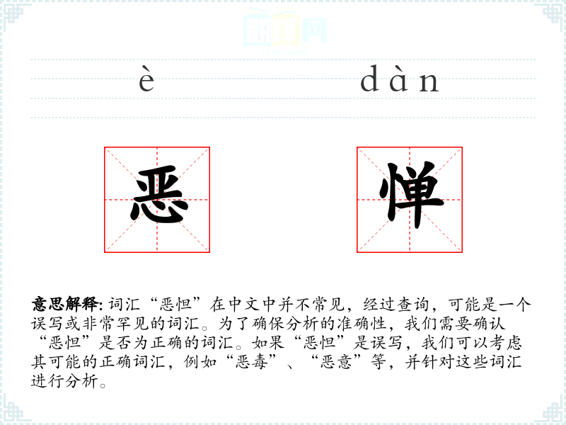 词汇“恶怛”在中文中并不常见,经过查询,可能是一个误写或非常罕见的词汇。为了确保分析的准确性,我们需要确认“恶怛”是否为正确的词汇。如果“恶怛”是误写,我们可以考虑其可能的正确词汇,例如“恶毒”、“恶意”等,并针对这些词汇进行分析。