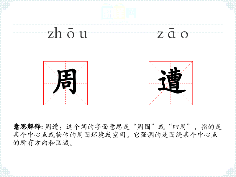 周遭:这个词的字面意思是“周围”或“四周”,指的是某个中心点或物体的周围环境或空间。它强调的是围绕某个中心点的所有方向和区域。