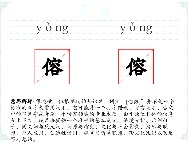 很抱歉,但根据我的知识库,词汇“[傛傛]”并不是一个标准的汉字或常用词汇。它可能是一个打字错误、方言词汇、古文中的罕见字或者是一个特定领域的专业术语。由于缺乏具体的信息和上下文,我无法提供一个准确的基本定义、语境分析、示例句子、同义词与反义词、词源与演变、文化与社会背景、情感与联想、个人应用、创造性使用、视觉与听觉联想、跨文化比较以及反思与总结。