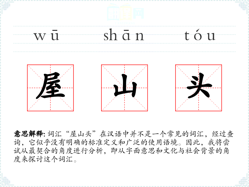 词汇“屋山头”在汉语中并不是一个常见的词汇,经过查询,它似乎没有明确的标准定义和广泛的使用语境。因此,我将尝试从最契合的角度进行分析,即从字面意思和文化与社会背景的角度来探讨这个词汇。