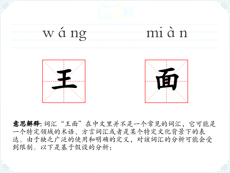 由于“王面”不是一个标准词汇,对其的理解和应用可能需要结合具体的语境和文化背景。在学习语言和表达时,了解特定词汇的背景和用法是非常重要的。对于“王面”这样的词汇,可能需要更多的研究和实际应用来深入理解其含义和用法。