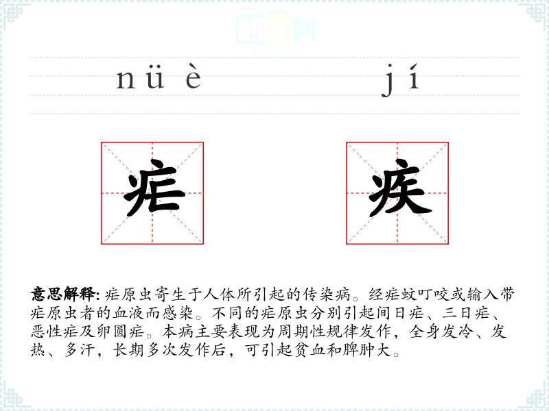 1.疟原虫寄生于人体所引起的传染病。经疟蚊叮咬或输入带疟原虫者的血液而感染。不同的疟原虫分别引起间日疟、三日疟、恶性疟及卵圆疟。本病主要表现为周期性规律发作,全身发冷、发热、多汗,长期多次发作后,可引起贫血和脾肿大。