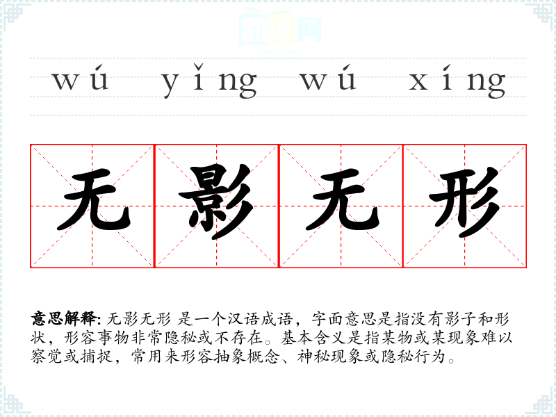 无影无形 是一个汉语成语,字面意思是指没有影子和形状,形容事物非常隐秘或不存在。基本含义是指某物或某现象难以察觉或捕捉,常用来形容抽象概念、神秘现象或隐秘行为。