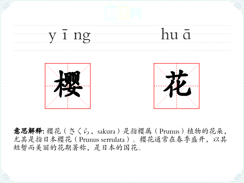 - 同义词:樱(さくら,sakura)、樱桃花(ying tao hua)