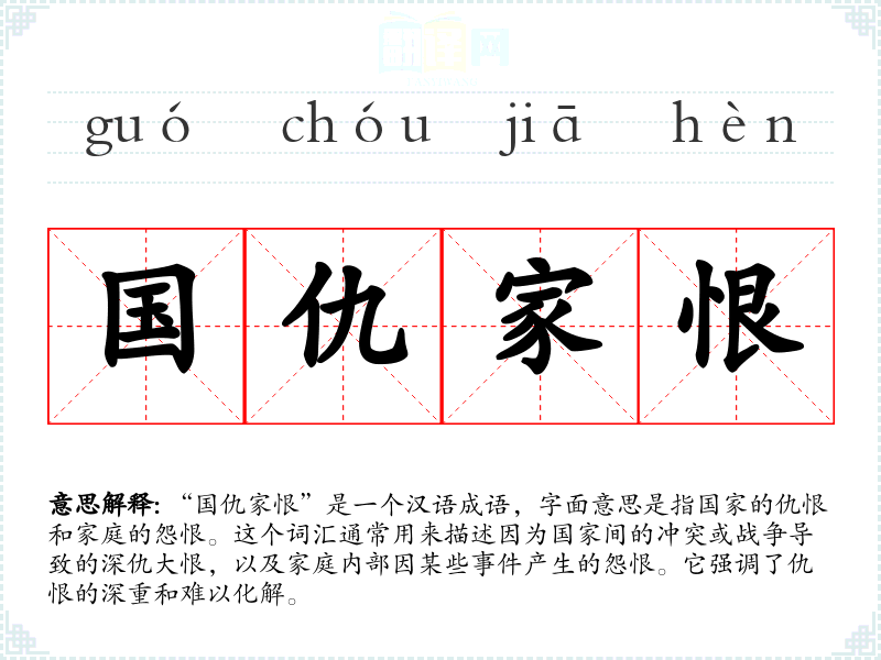 “国仇家恨”是一个汉语成语,字面意思是指国家的仇恨和家庭的怨恨。这个词汇通常用来描述因为国家间的冲突或战争导致的深仇大恨,以及家庭内部因某些**产生的怨恨。它强调了仇恨的深重和难以化解。