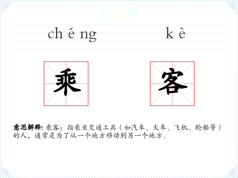 乘客:指乘坐交通工具(如汽车、火车、飞机、轮船等)的人,通常是为了从一个地方移动到另一个地方。