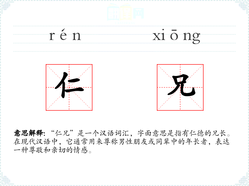 - 口语语境:在日常口语中,年轻人可能会用“仁兄”来称呼比自己年长的朋友,带有一定的戏谑或亲切感。
