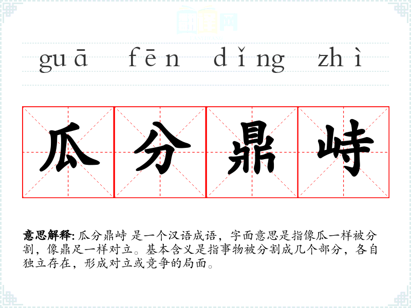 瓜分鼎峙 是一个汉语成语,字面意思是指像瓜一样被分割,像鼎足一样对立。基本含义是指事物被分割成几个部分,各自独立存在,形成对立或竞争的局面。