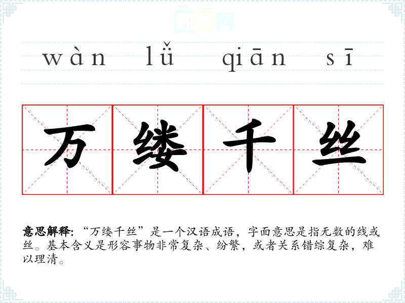 “万缕千丝”是一个汉语成语,字面意思是指无数的线或丝。基本含义是形容事物非常复杂、纷繁,或者关系错综复杂,难以理清。