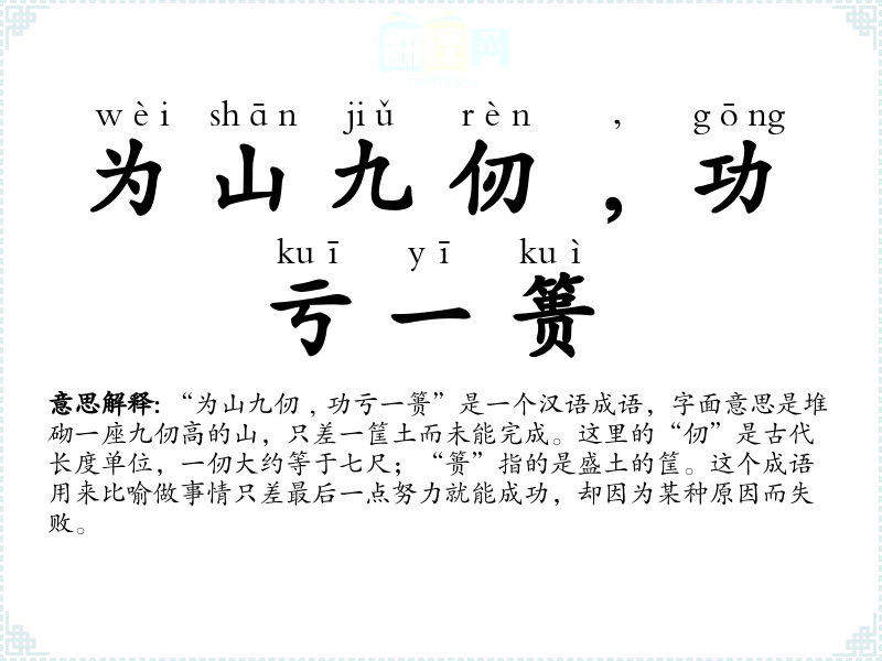“为山九仞﹐功亏一篑”是一个汉语成语,字面意思是堆砌一座九仞高的山,只差一筐土而未能完成。这里的“仞”是古代长度单位,一仞大约等于七尺;“篑”指的是盛土的筐。这个成语用来比喻做事情只差最后一点努力就能成功,却因为某种原因而失败。