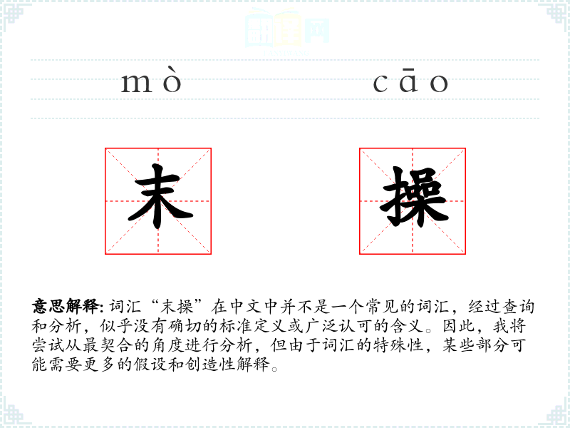 由于“末操”不是一个标准词汇,我们无法提供一个确切的基本定义。它可能是某个特定领域或方言中的词汇,或者是某个特定文献中的创造性用法。