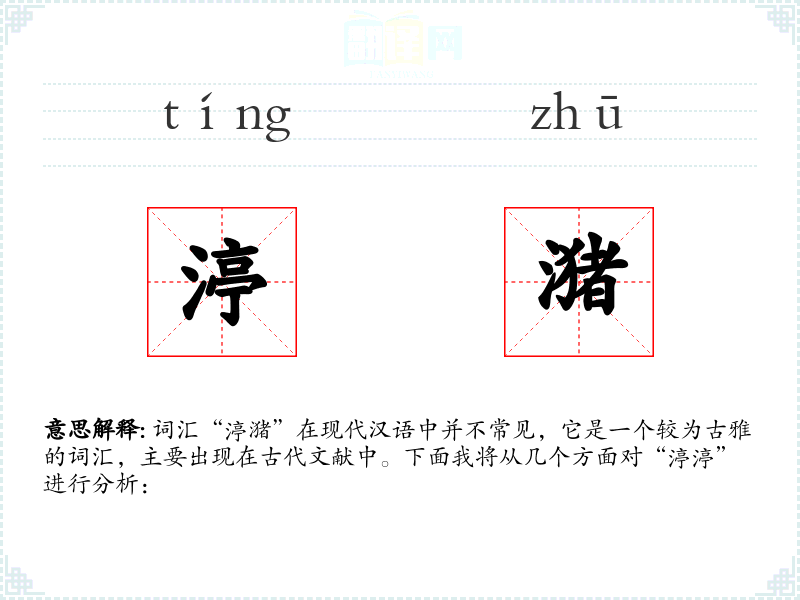 词汇“渟潴”在现代汉语中并不常见,它是一个较为古雅的词汇,主要出现在古代文献中。下面我将从几个方面对“渟渟”进行分析: