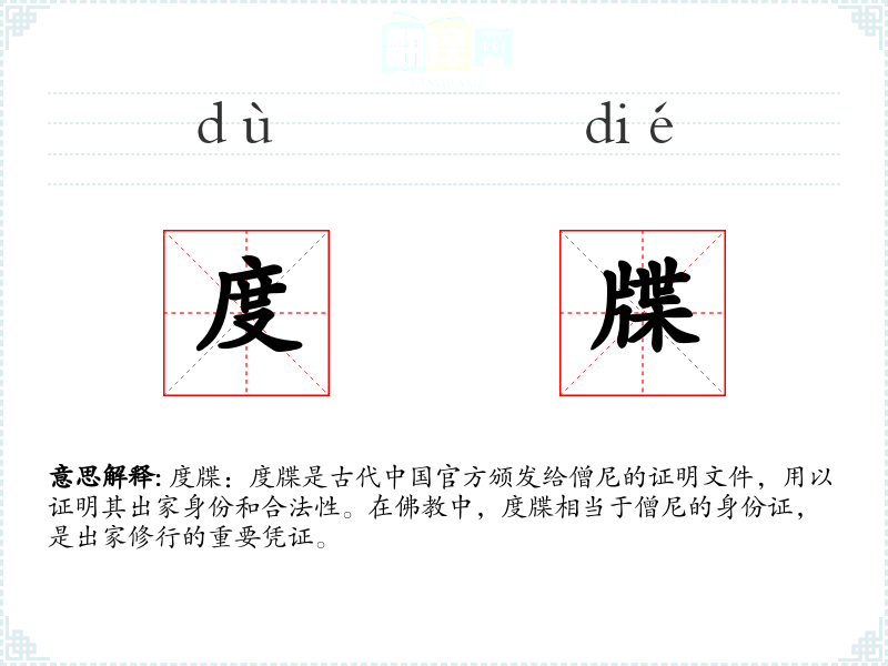 理解:度牒不仅是古代僧尼的身份证明,也是文化和社会管理的重要组成部分。 重要性*:在学和研究历史时,度牒是一个不可或缺的关键词汇,它帮助我们更好地理解古代政策和社会结构。