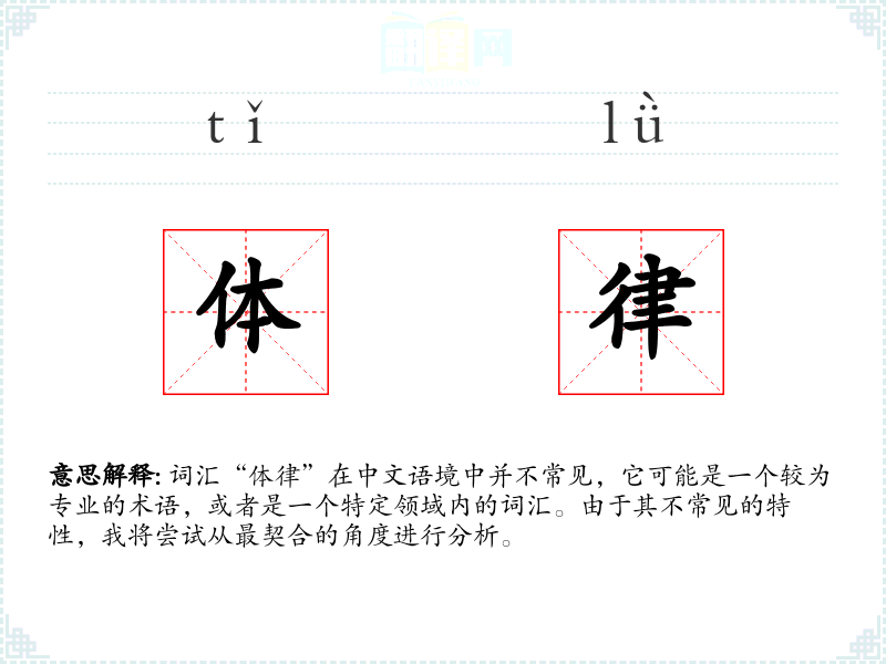 词汇“体律”在中文语境中并不常见,它可能是一个较为专业的术语,或者是一个特定领域内的词汇。由于其不常见的特性,我将尝试从最契合的角度进行分析。