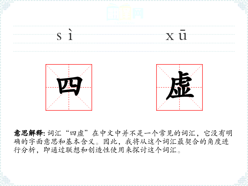 词汇“四虚”在中文中并不是一个常见的词汇,它没有明确的字面意思和基本含义。因此,我将从这个词汇最契合的角度进行分析,即通过联想和创造性使用来探讨这个词汇。