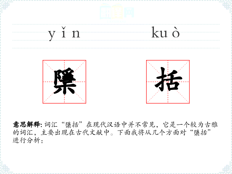 “檃括”(yǐn kuò)的字面意思是隐括、包含。在古代文献中,它常用来形容某种隐晦或含蓄的表达方式,或者指某种事物包含了更多的内容或意义。