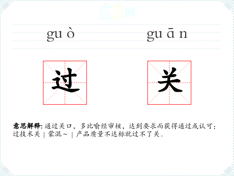 通过关口,多比喻经审核,达到要求而获得通过或认可:过技术关|蒙混~|产品质量不达标就过不了关。