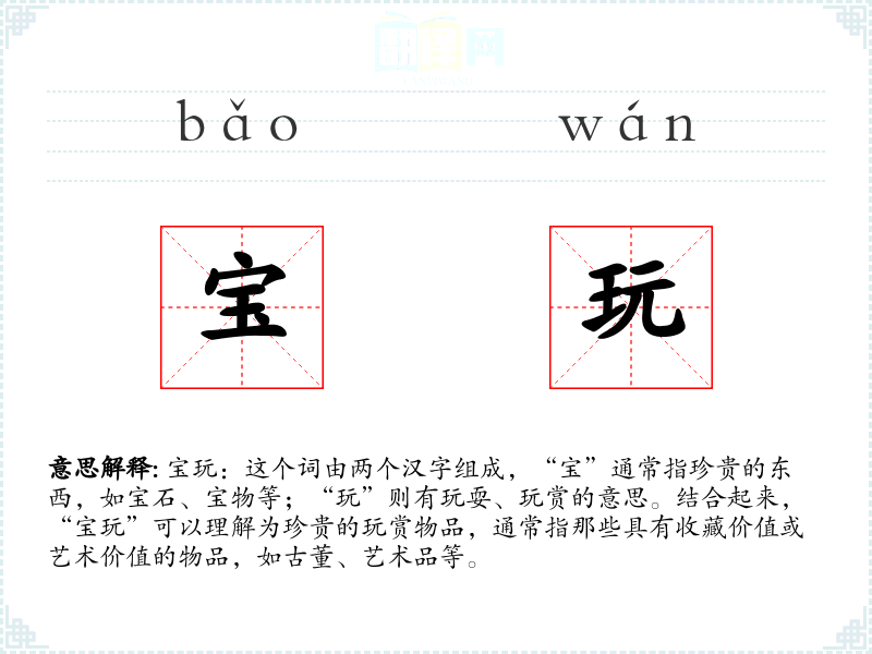 宝玩:这个词由两个汉字组成,“宝”通常指珍贵的东西,如宝石、宝物等;“玩”则有玩耍、玩赏的意思。结合起来,“宝玩”可以理解为珍贵的玩赏物品,通常指那些具有收藏价值或艺术价值的物品,如古董、艺术品等。