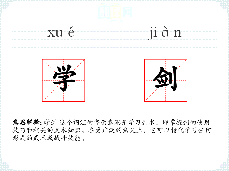 学剑 这个词汇的字面意思是学剑术,即掌握剑的使用技巧和相关的武术知识。在更广泛的意义上,它可以指代学任何形式的武术或战斗技能。
